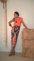 Vestido estampado en tonos naranja, marrón y beige. Presenta hombreras estructuradas y cintura drapeada que estiliza la silueta. Diseñado y fabricado íntegramente en España. Composición: 100% Lino- 225€