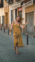Vestido en color mostaza con palmera en contraste. Detalle de tirantes y bajo con flecos que aporta un toque distintivo. Diseñado y fabricado íntegramente en España. Composición: 100% Lino- 250€
