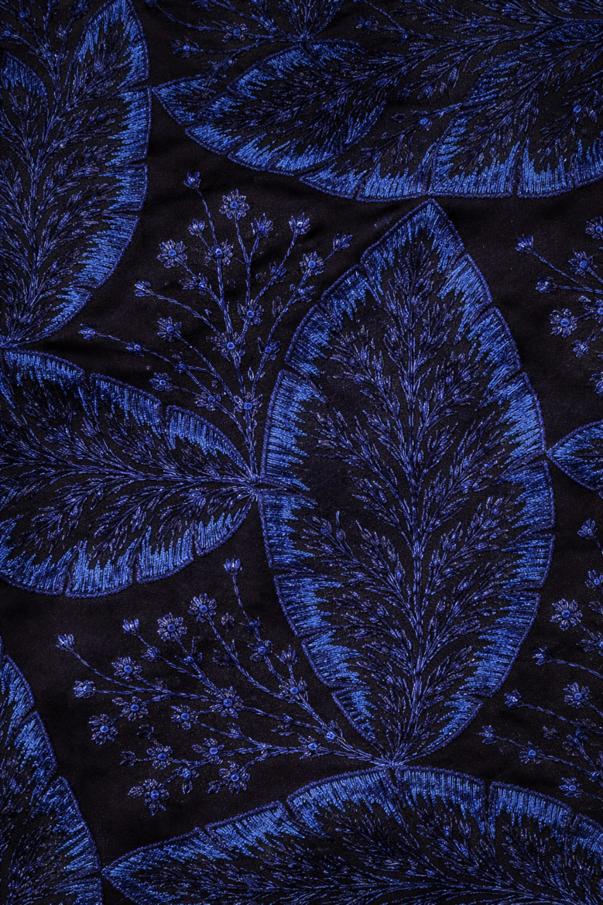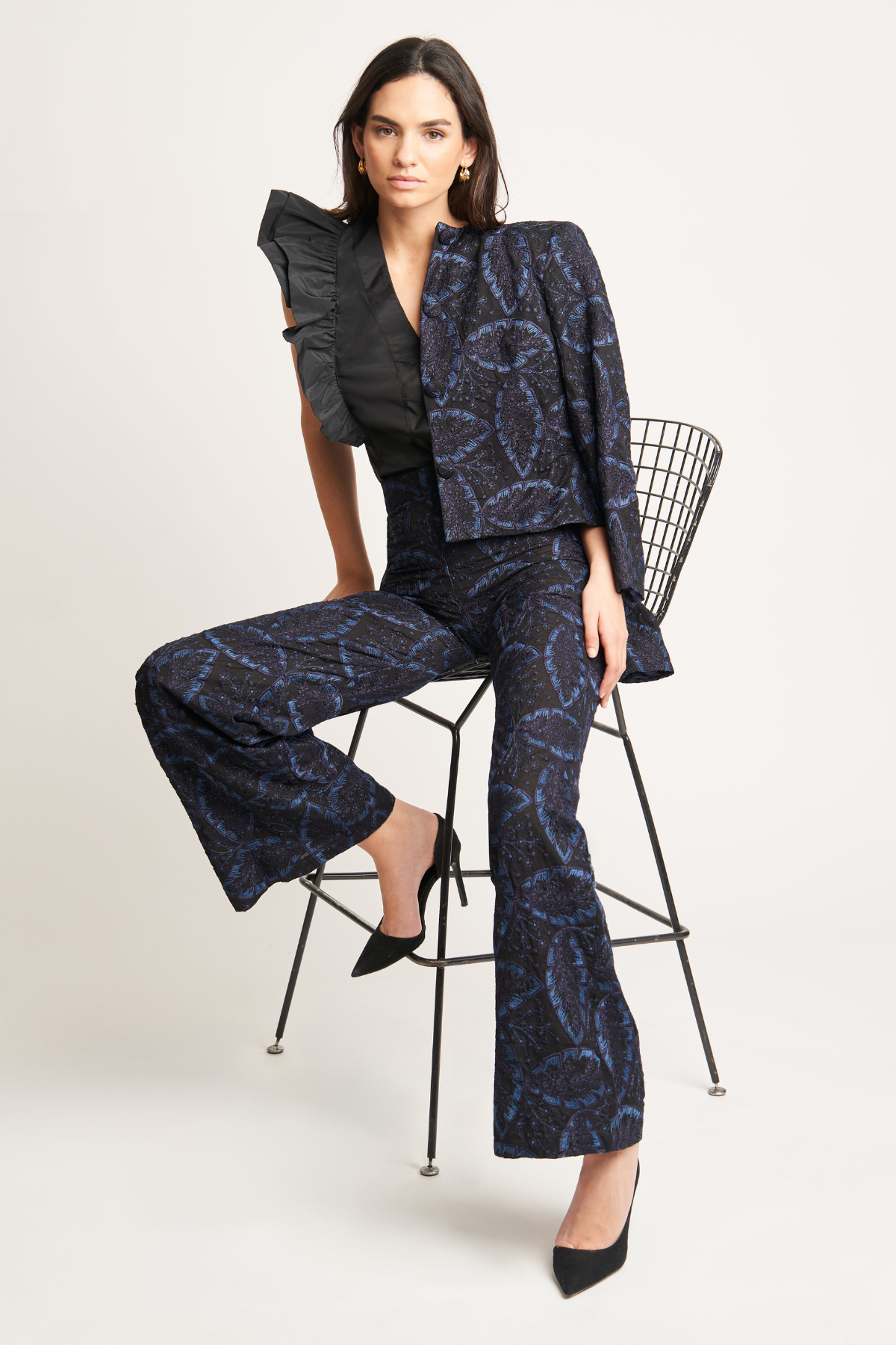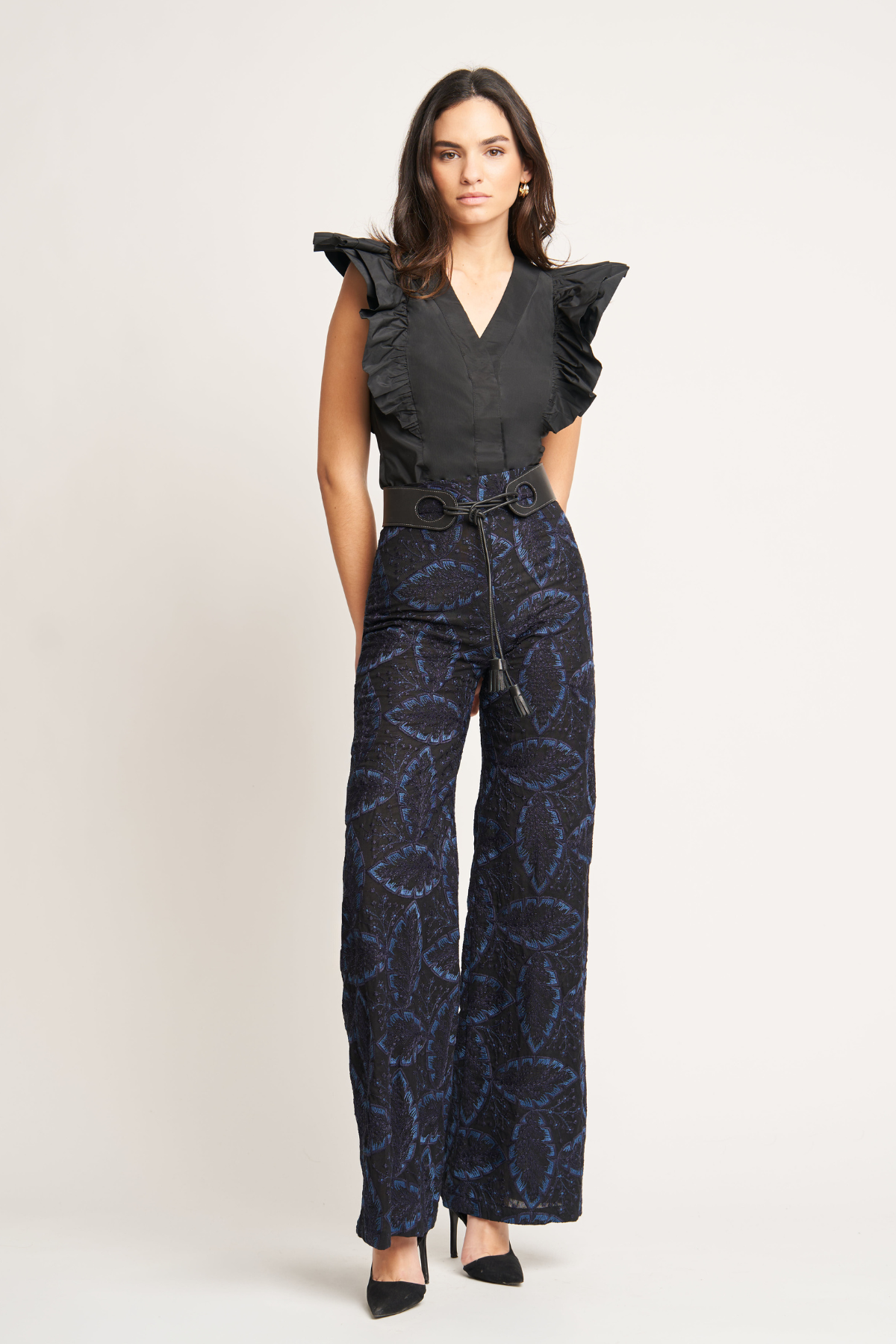 Pantalón bordado con flores en azul noche sobre fondo negro. Tiro alto y pernera recta ligeramente amplia que estiliza la silueta. Cierre mediante cremallera invisible.
